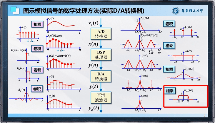 如下图所示,数字信号处理的频域处理技术的本质就是这里:我们先对一个信号时域上离散化,然后转成频域,但我们计算机只能离散化这个频域;离散化之后可以对这个频域进行一些如低通滤波处理;之后再从这个离散化的频域 DFS 转回时域的信号。此时,时域信号是周期的,我们保留主周期即可。