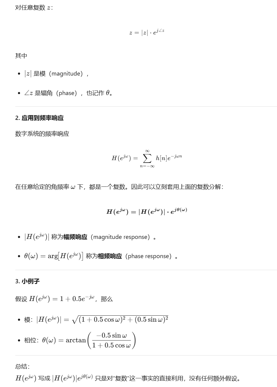 一个很重要的知识点,系统频率响应一定可以写成如下公式,其中 \(|H(e^jw)|\) 叫做幅频响应,后面叫做相频响应: