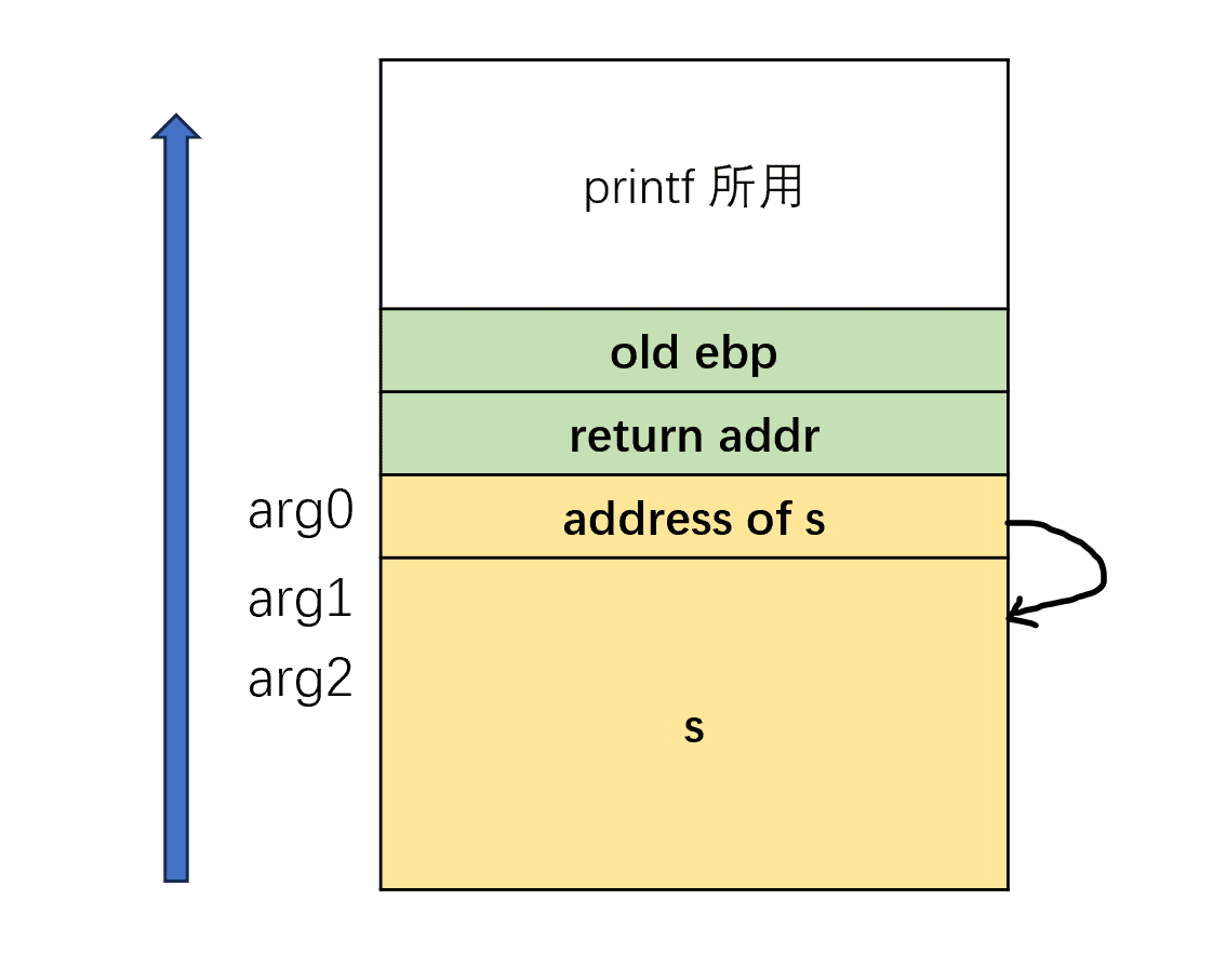 当进行到 printf(s) 中的 call printf 的时候,栈结构如下(实际情况可能 s 不是立刻就在下方,可能有间隔,需要自行在 gdb 中查看):