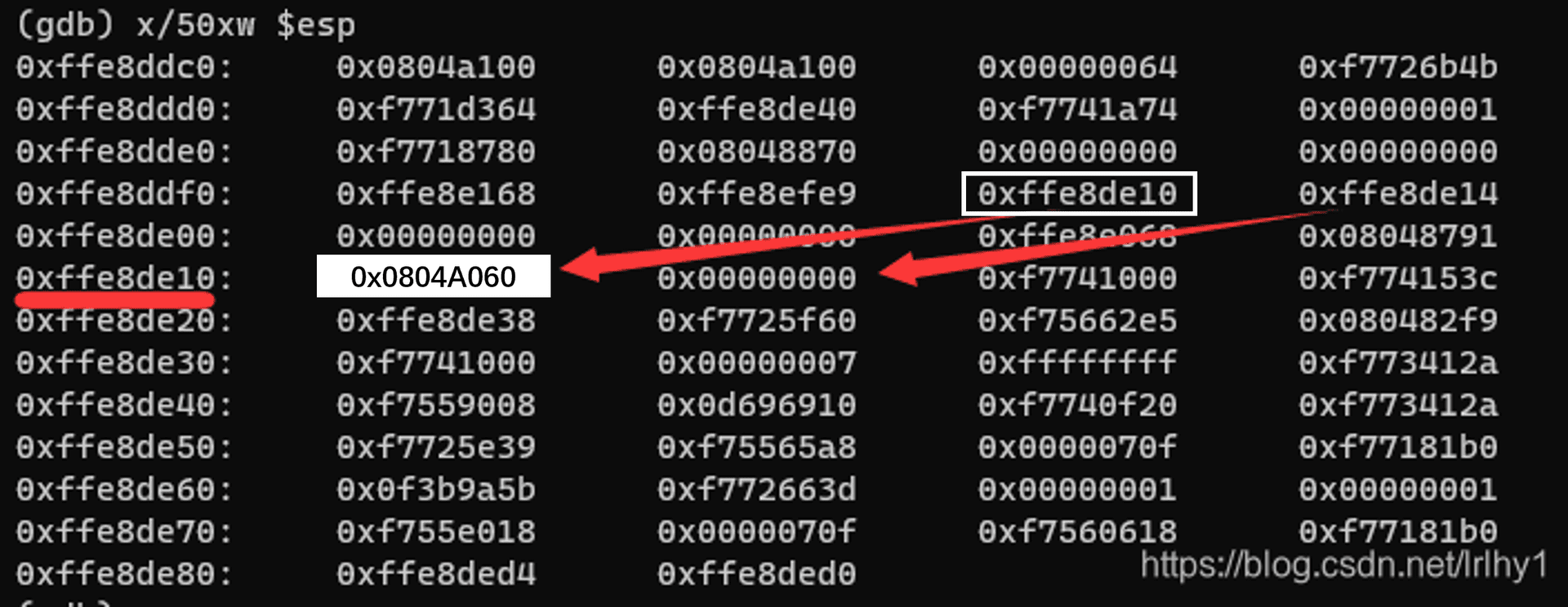 0xffe7de10指向第 20 个偏移(0xffe8de10) - 第 15 个偏移中的内容