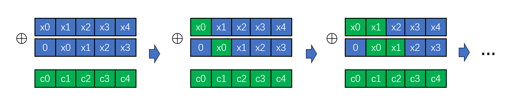 所以如下图所示,我们逐步的去求解即可。我们按照每 12 bit 划分,最后的 x5 其实是 4bit,这个暂且忽略,就假设地址是 60 bit 吧。x0-x4 是正确的地址,c0-c4 是密文,即 e->next。蓝色是未知、绿色是已知,我们逐步能推出来...