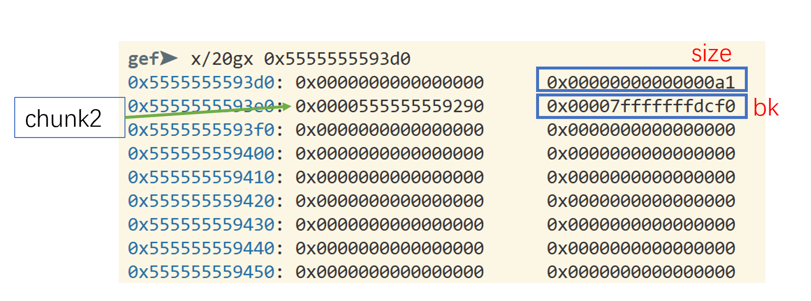 → Chunk2(addr=0x5555555593e0, size=0xa0) → Chunk0(addr=0x5555555592a0, size=0xa0)