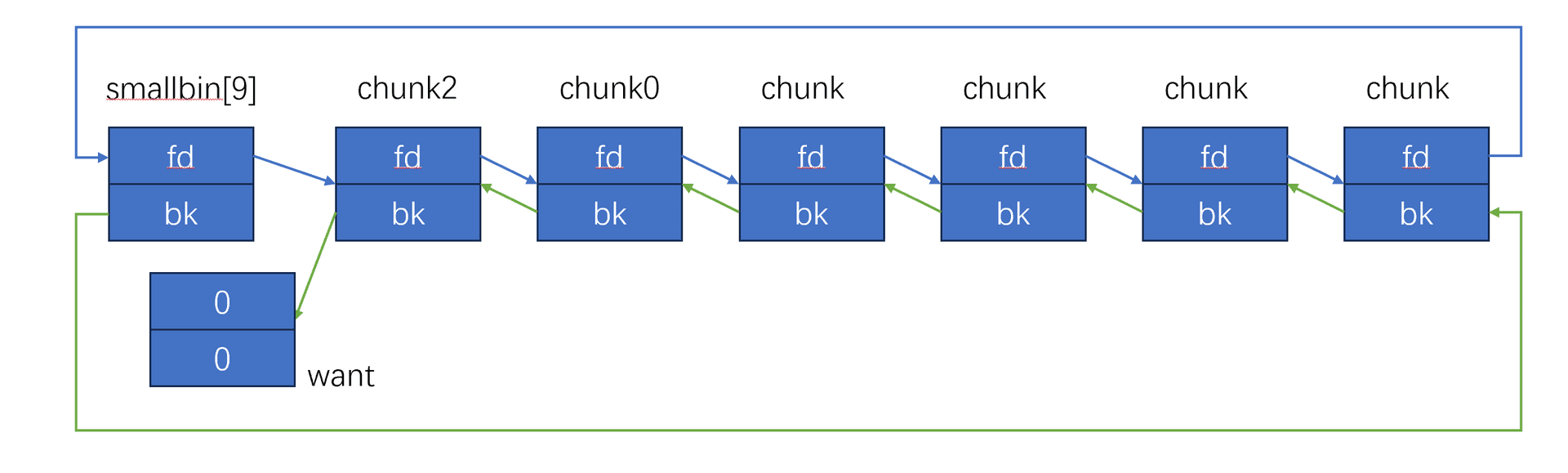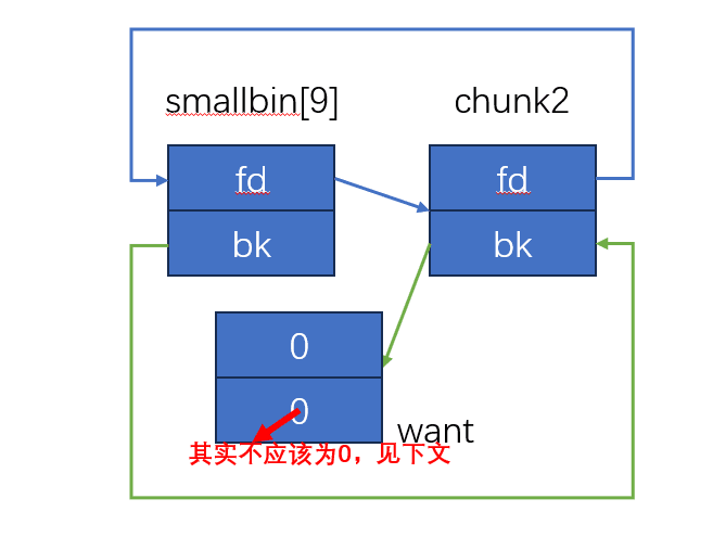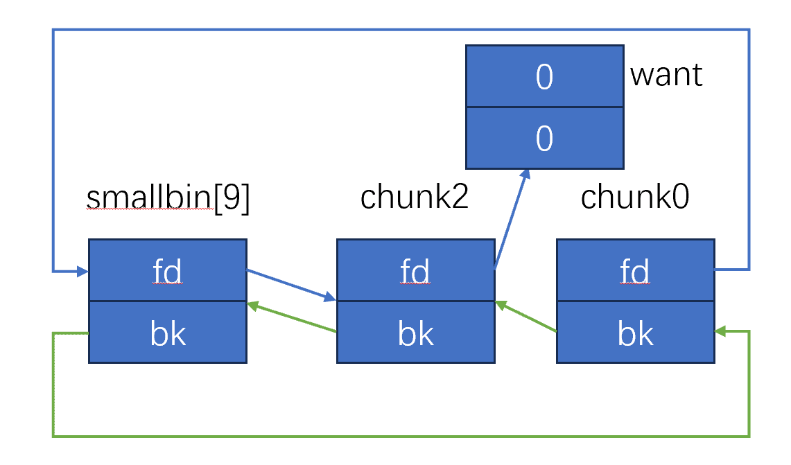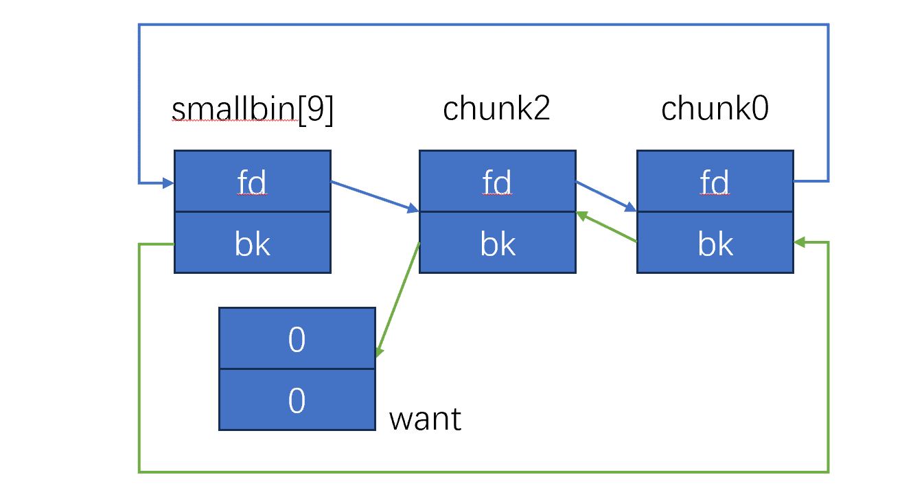 stash 也是通过 bk 来的,由于 tcache 还有两个块,所以 chunk2 和 want 都放入了 tcache 中,最终就是: