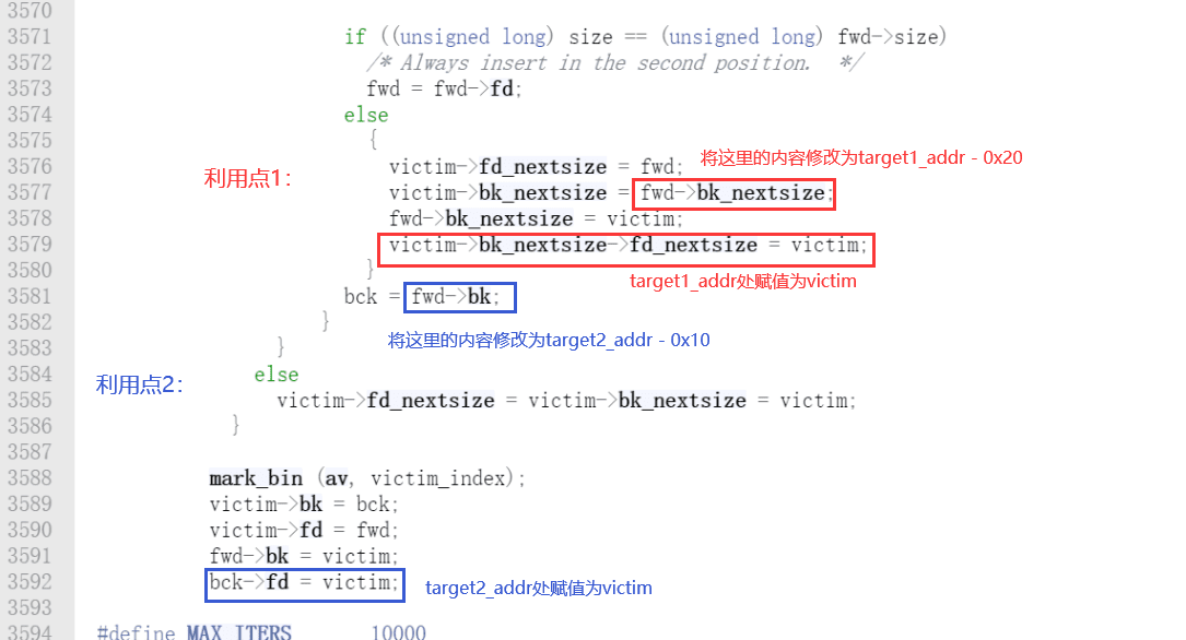 (target_addr-0x20)->fd_nextsize = victim;