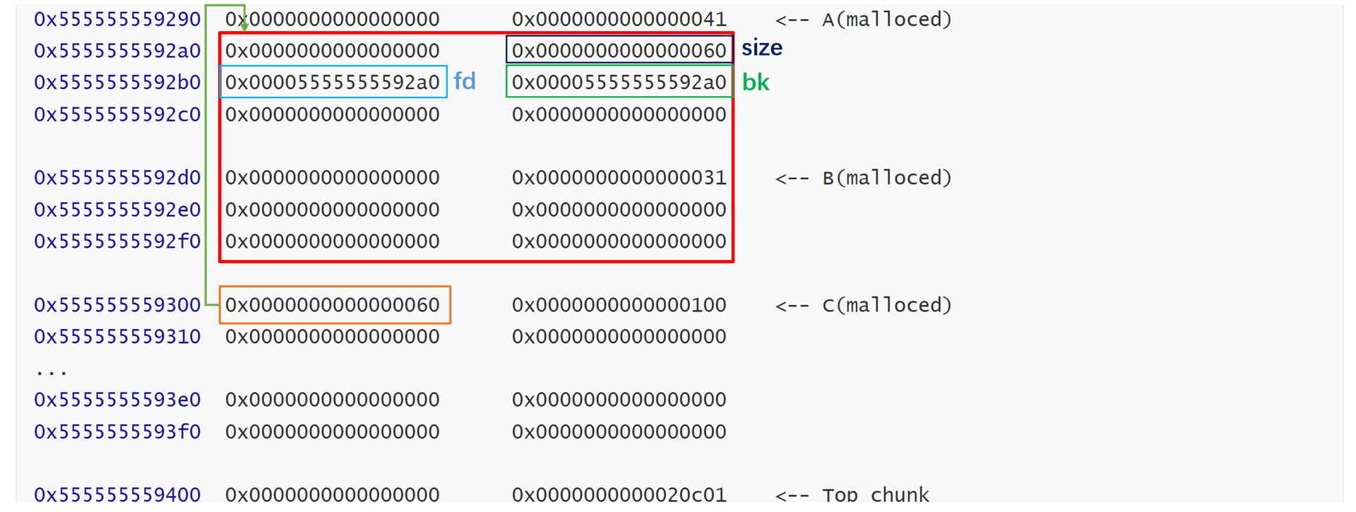 如下图所示,这是从 house of einherjar 拿来的图。我们构造了 size、fd 等数据,然后我们 free(c) 就会把红色框的部分合并。