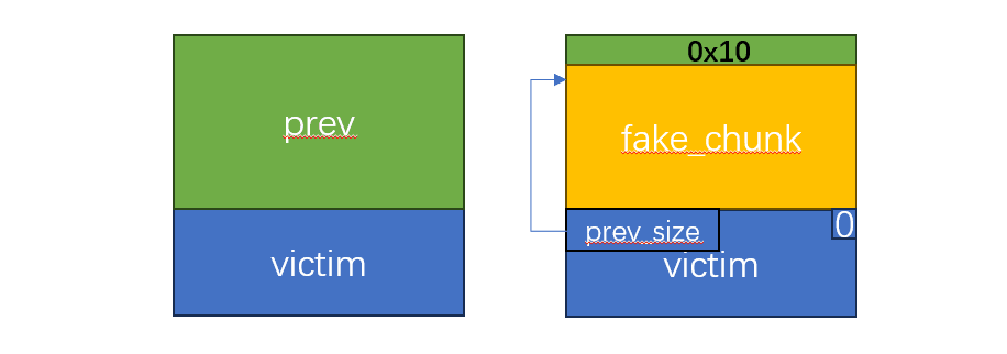 之后就修改 victim 的 prev_in_use 和 prev_size,还有构造 fake_chunk 的 size,然后 free(victim) 即可,达到和 House of einherjar 一样的效果。