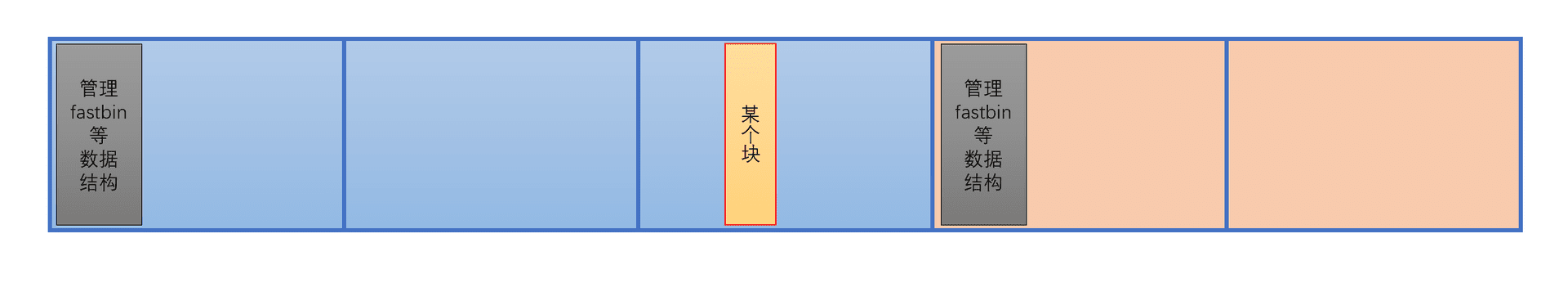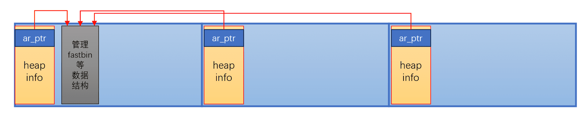 这里说一下 glibc 的做法,其实它有点像第二小点,在开头标上指针。这里的管理内容叫 heap_info,只不过 heap_info 里面其中一项存的是 ar_ptr,即管理 fastbin 链表等数据结构的地方。如下图所示: