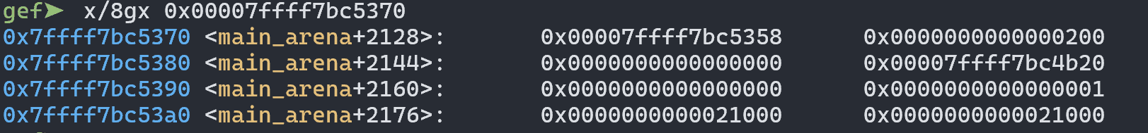 第二个就是 leak+0x7f8,这个地址是 binmap-0x8,之所以是要偏移 -0x8,可以看下面第三块中找到答案: