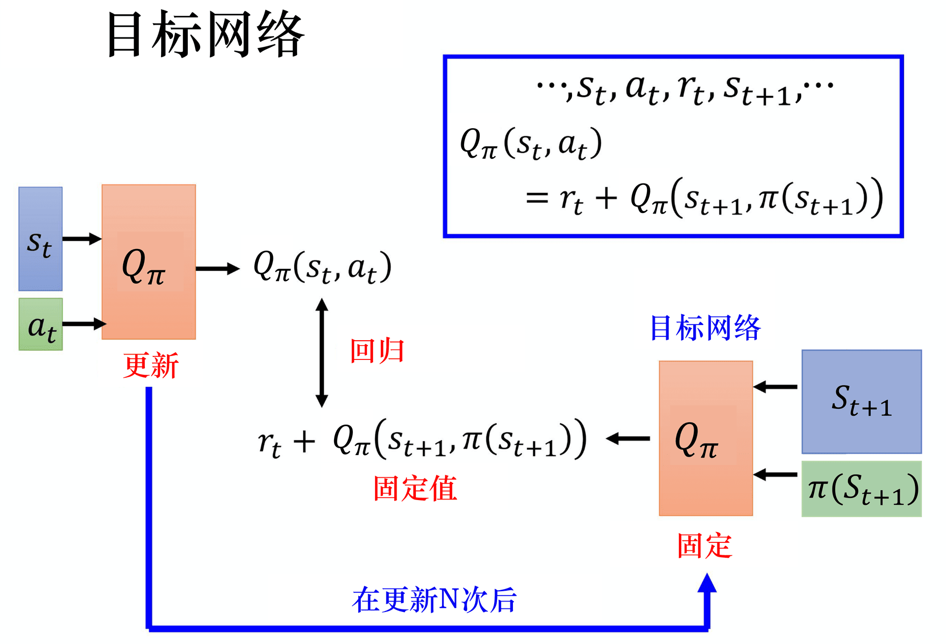 - 目标网络(Target Network) :用于计算 TD 目标,它的参数会滞后于主网络,从而提供更稳定的目标值。