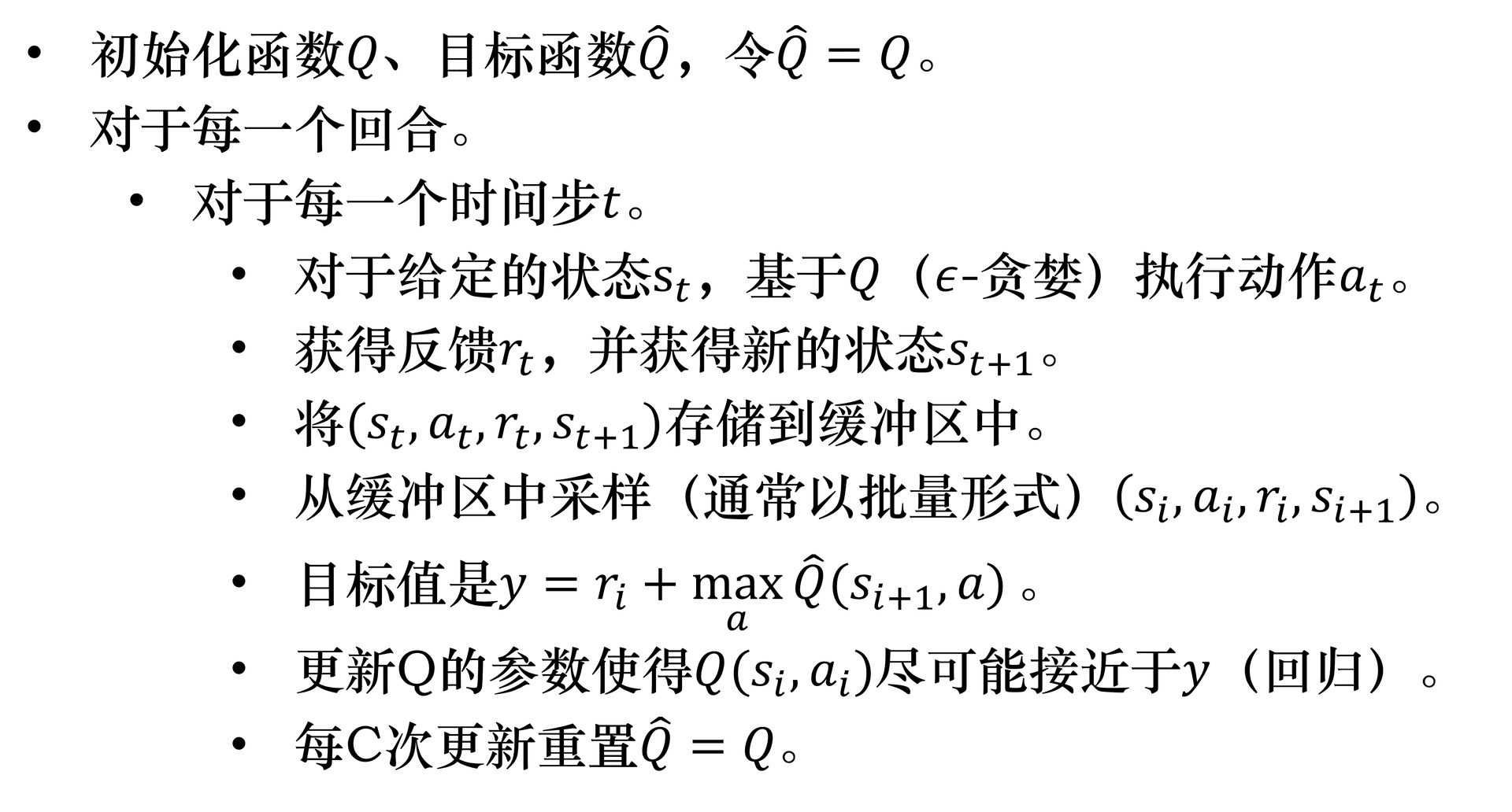 这会带来训练的不稳定的偏差。为了解决这个问题,我们可以「假装」目标值是固定的,也就是说,在给损失函数求梯度时,我们认为 \(r + \gamma \max_{a'} Q_\omega(s', a')\) 是个常数,而只给 \(Q_\omega(s, a)\) 求导,然后像标准梯度下降一样对当前估计值计算梯度,然后更新参数。