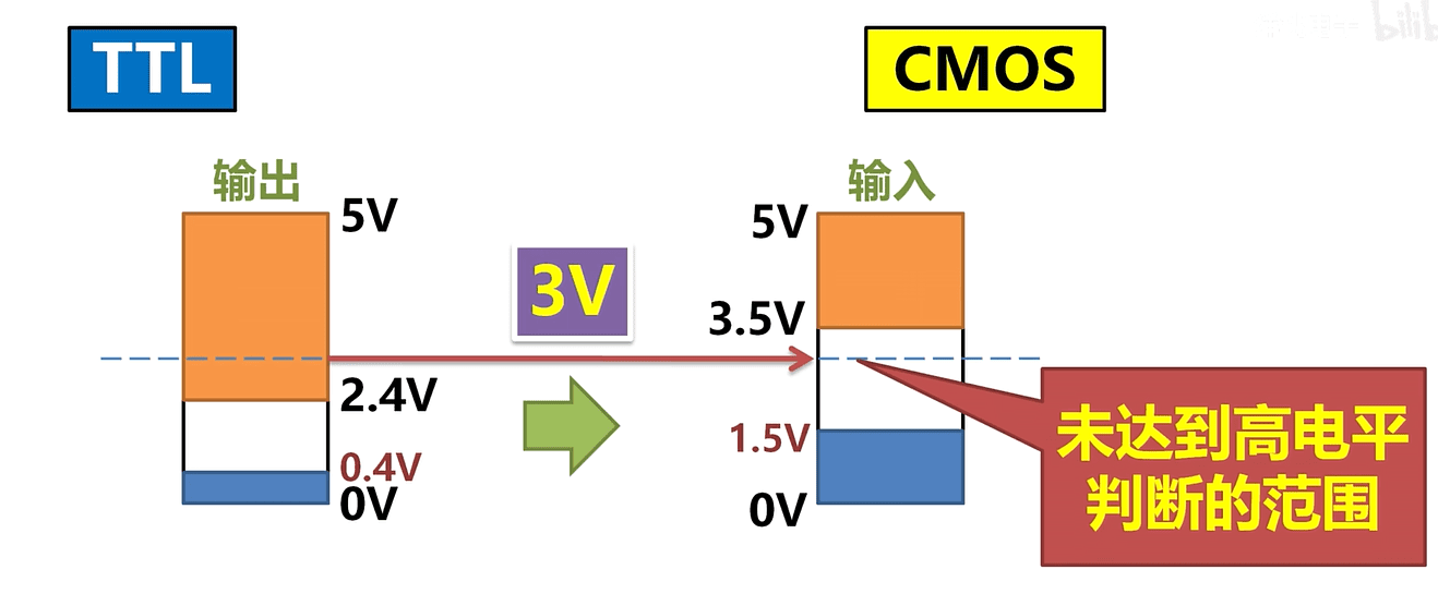 需要知道 CMOS 和 TTL 分别表示什么东西,CMOS 就是用 MOS 管进行搭建的电路,TTL 是用三极管搭建的电路。因为不同器件的特性,导致高低电平的范围不同。