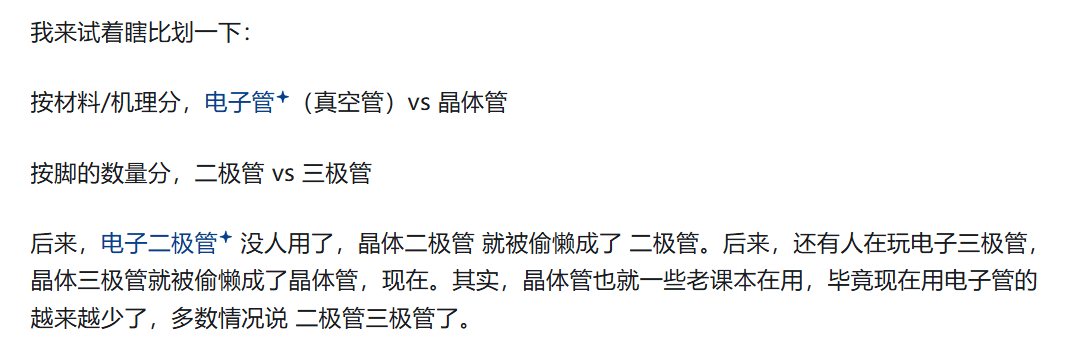 然后就是晶体管是什么?为什么大模型说:二极管不是晶体管,三极管是晶体管。其实...二级三级这些都是结构上,而晶体管对比的叫真空管,是材料上的差异。正确应该是叫晶体二极管和晶体三极管,这样才有区别于真空二极管和三极管。