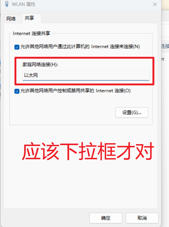 在一次 Windows共享网络(ICS)中,发现共享的时候没有下拉栏,只有一个输入框。找了好久的解决方法... 方法:重新做一次共享... 也就是先把共享的勾选去掉,然后确定;之后再回到这个界面上,勾选共享,然后就发现成下拉框哩。