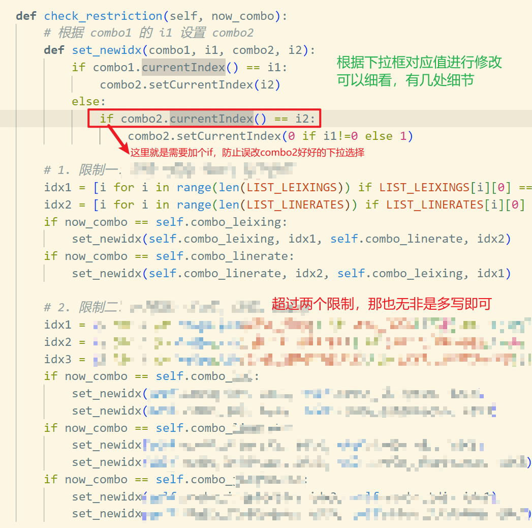 可以看到我写了一个 set_newidx 这个子函数,里面还是有一些细节的。除了如果是限制值则另一个下拉框要对应修改;还有:不是限制值则要另一个下拉框的原来对应的值也修改掉,但如果另一个下拉框不是原来对应值,那么不要修改。即限制是A,10时,当前组合也是A,10时,如果从A改成B,那么就要把10也改变,防止出现B,10这种错误;原来是B,20,如果从B改成C,则不需要把20改掉,即最后为C,20。