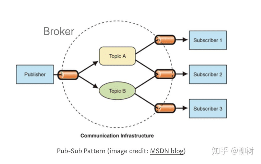 有的时候这个模式也叫做另一个名字,你绝对听过:发布-订阅。所以其实一目了然了,当然有的教条主义非要区分二者:发布-订阅中间有个专门负责转发的人: