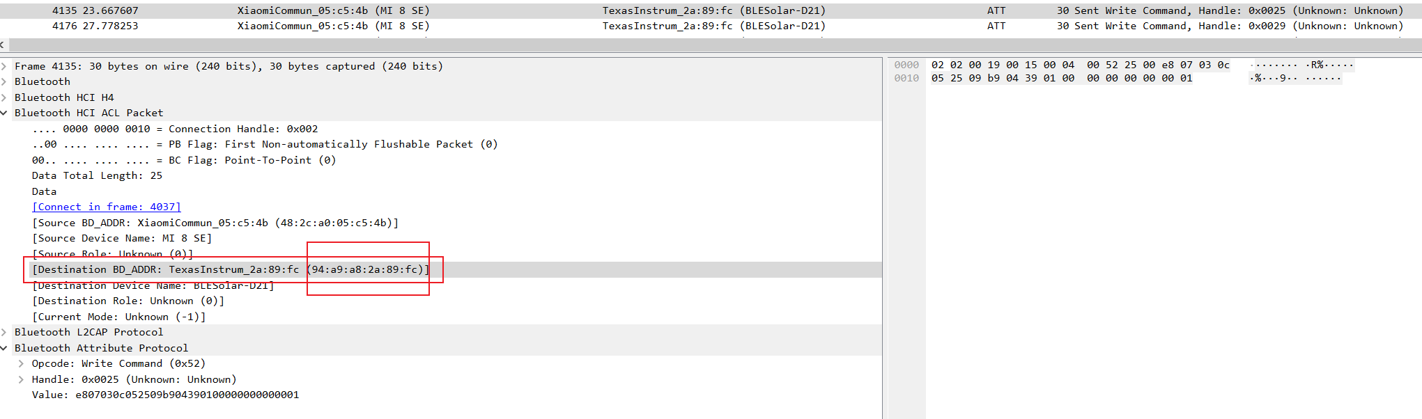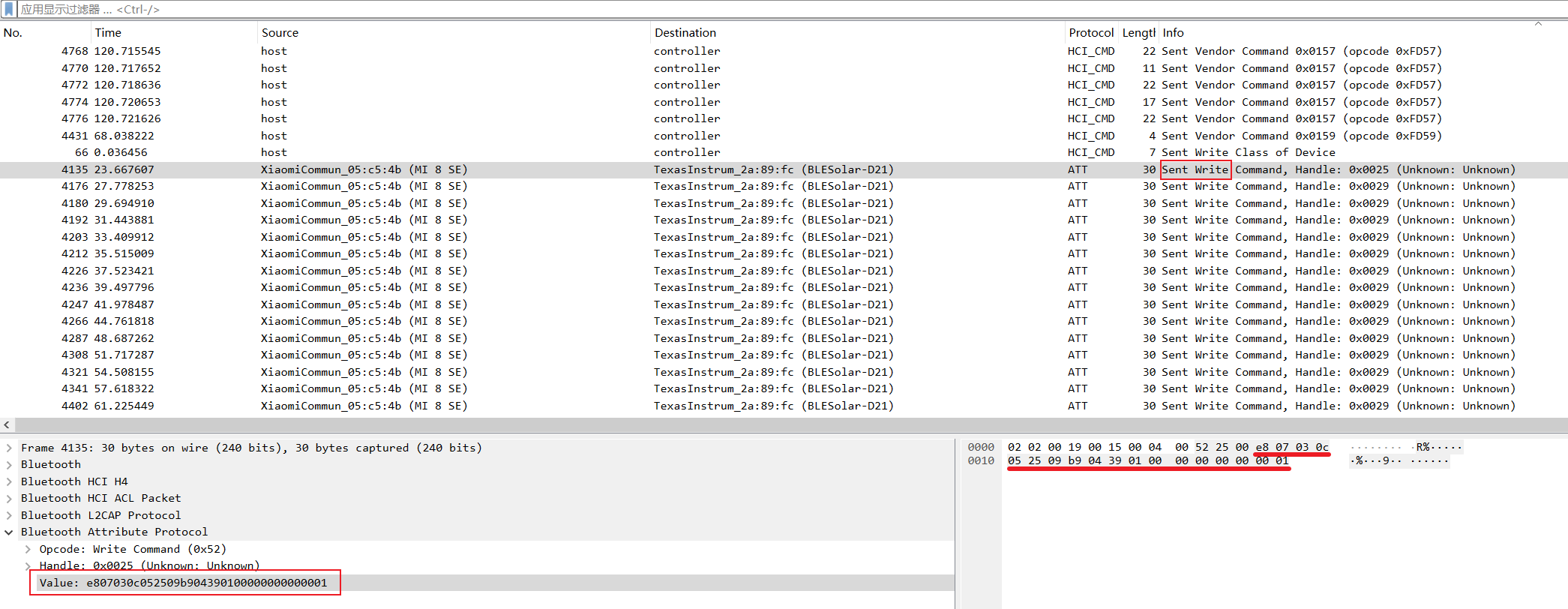 上图中有两种 write,0x25和0x29,由于下面全是 0x29,所以 0x29 才是我们发送的命令,而数据包中的 value 就是我们需要重放的数据。
