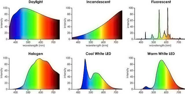 因此这就是光谱图的意义,比如下面就是不同光源的光谱图(阳光、白炽灯、荧光灯、卤素灯、冷色 LED、暖色 LED)。