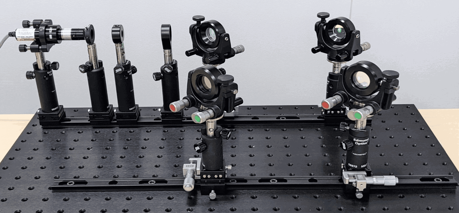 马赫-曾德尔干涉仪(Mach-Zehnder Interferometer)由一个相干光源(如:激光)、两个分光镜和两个反射镜组成。首先,利用第一个分光镜将光源分成两路。这两束光各自具有相同的光路长度,即行进的距离乘以它们经过的介质的折射率。每个光束从一个反射镜上反射出来,并由第二个分光镜重新组合。如果两束光的光路长度之差小于光源的相干长度,就会产生干涉条纹。由于光源的相干长度可能极短,因此精密的部件和对准是至关重要的。样品可以通过放在其中一个光束路径上进行测量。由此产生的光路长度差可以通过观察干涉条纹的变化来测量。
