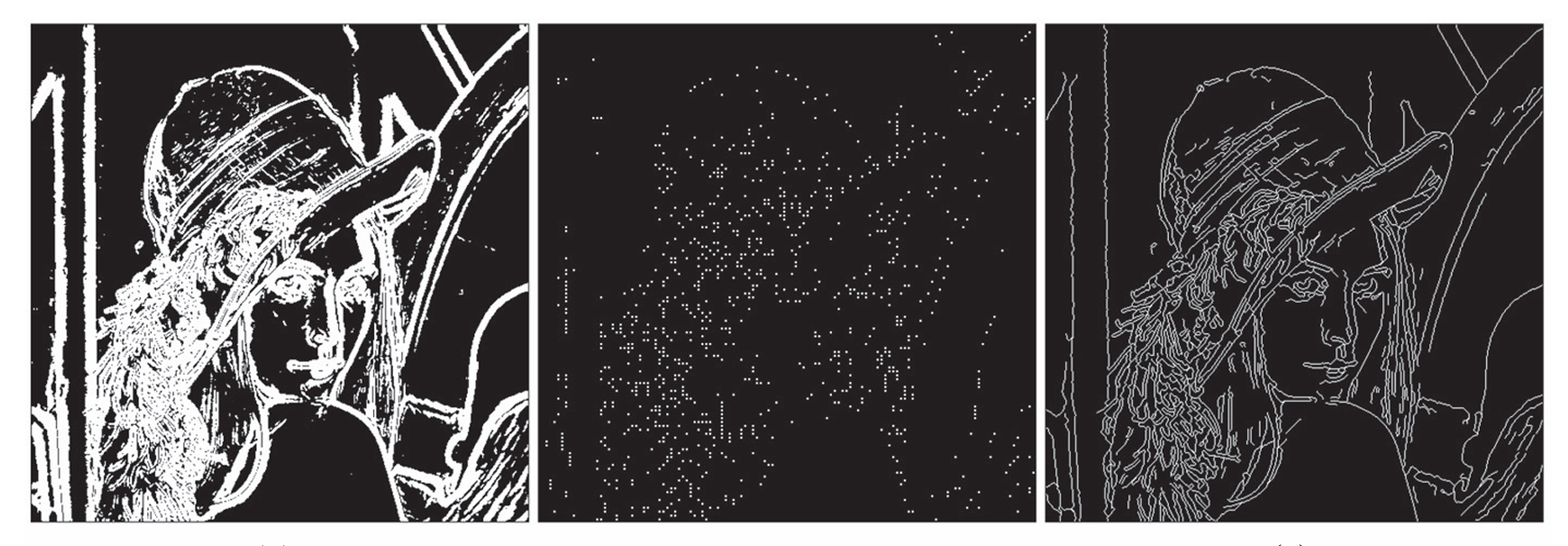 流程一:模糊图片,对图像求梯度,得到大小、方向,然后进行简单的分类,得到初始粗糙的边。