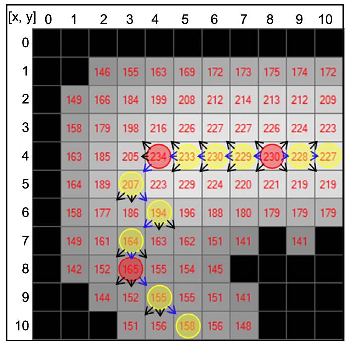 其实就是 DFS,只不过这里每次要看当前的点的方向,如果是横向就只能左右走,竖向就只能上下走。每次走的时候有三个选项,选择梯度最大的点。比如向左边走,就要比较左上、左中、左下三个点,选择梯度最大的点。遇到边界、平滑区域、访问过的点就停止。