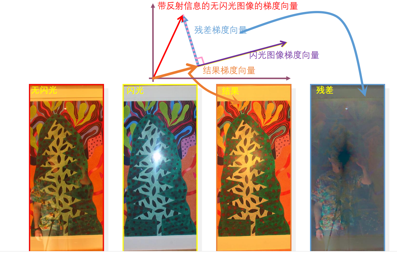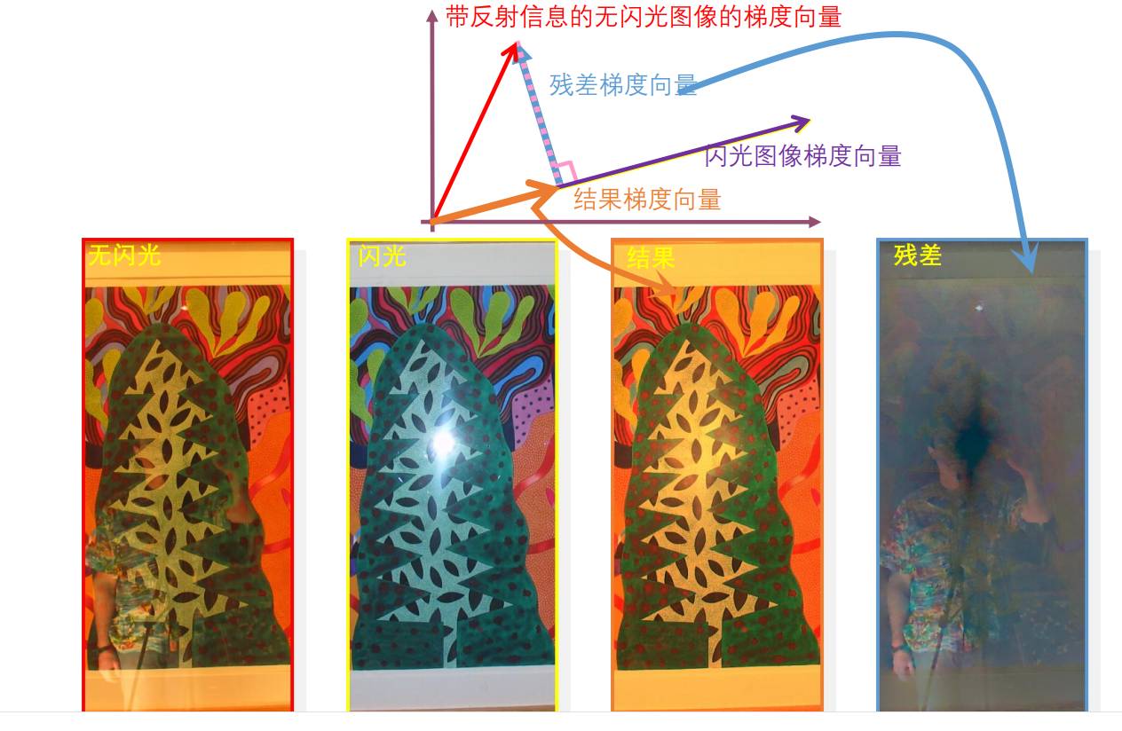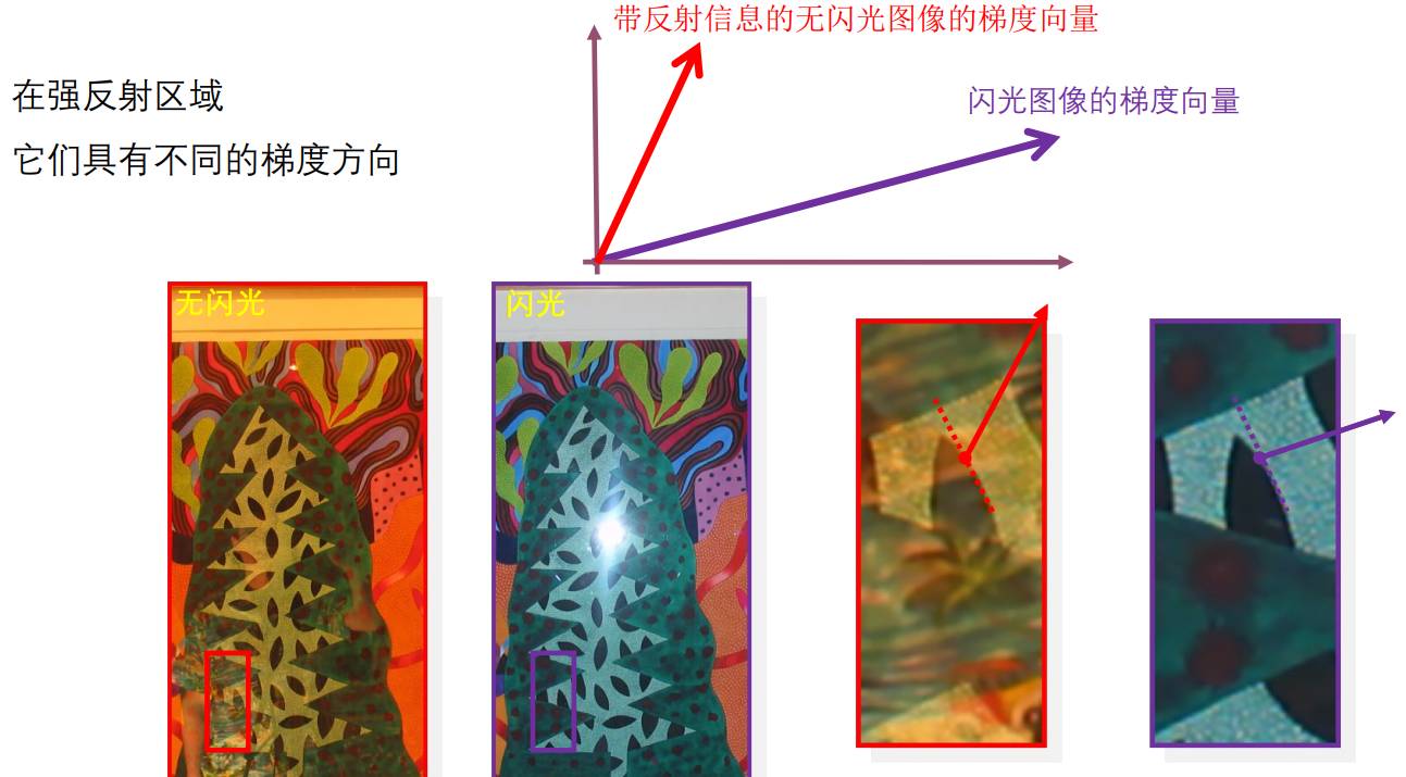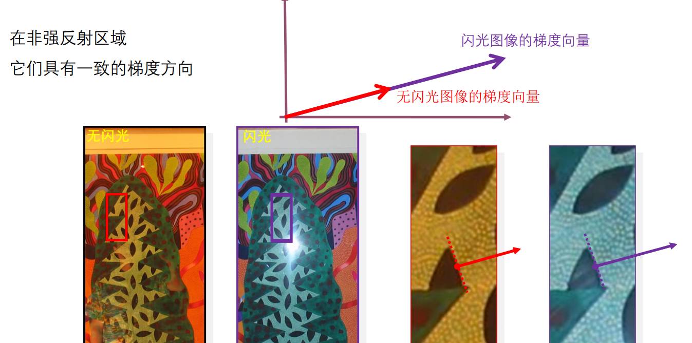此时用梯度投影就能够消除反射,如果闪光有反射,那就闪光映射到非闪光,反之亦然。