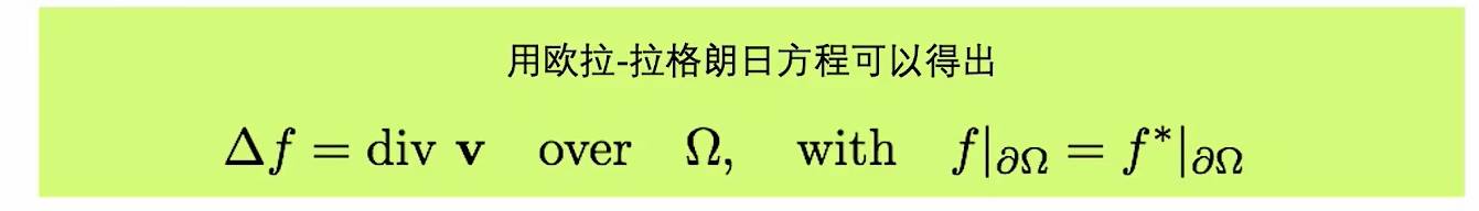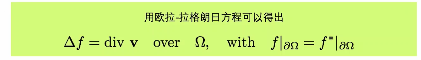 而我们上面一大段操作得到的新的梯度场,就是这里的 \(\mathbf{v}\),即这里的 \(u\) 和 \(v\)。所以 \(\text{div } \mathbf{v}\) 就用上面的第一行的公式即可得到,即梯度 \(u\) 和 \(v\) 分别再做一次行或列的梯度,然后加起来。