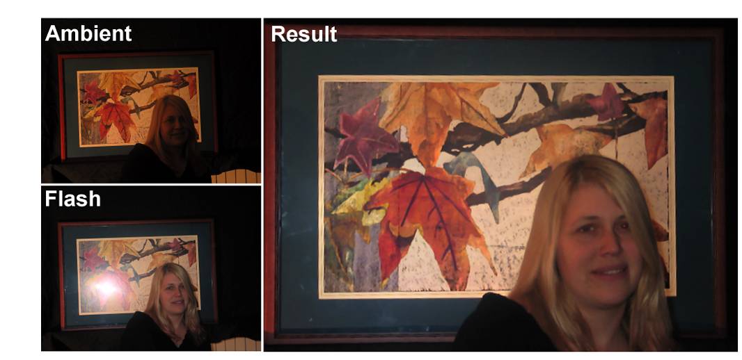 有的时候闪光和非闪光可能有反射现象,这个时候应该丢掉其中之一,但是联合双边滤波的方法无法做到这一点。比如第一张图时闪光有反射,第二张图时无闪光有反射。