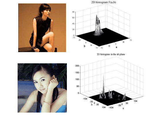 如上图所示,第一个美女图明显就偏色,其 ab 直方图明显有只有一个波峰,而第二个美女图则很协调,ab 直方图也分布的很均匀。