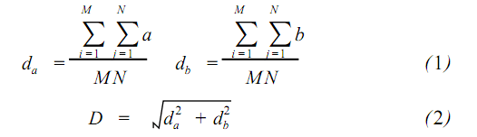 其中,M、N 分别为图像的宽和高,在 ab 色度平面上,等效圆的中心坐标为 (da,db)、半径为 M。等效圆的中心到 ab 色度平面原点距离 D。由等效圆在 ab色度平面上的具体位置,来判断图像整体的偏色。da > 0 偏红,否则偏绿。db > 0 偏黄,否则偏蓝。引入偏色因子 K, K 值越大 ,偏色越严重。
