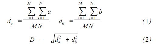 其中,M、N 分别为图像的宽和高,在 ab 色度平面上,等效圆的中心坐标为 (da,db)、半径为 M。等效圆的中心到 ab 色度平面原点距离 D。由等效圆在 ab色度平面上的具体位置,来判断图像整体的偏色。da > 0 偏红,否则偏绿。db > 0 偏黄,否则偏蓝。引入偏色因子 K, K 值越大 ,偏色越严重。
