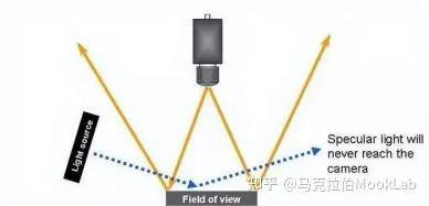 工业上也有类似原理的暗场照片,就是光源以低于45度入射的方式,如下图所示,基本原理也是类似,避免光源直接入射到镜头。