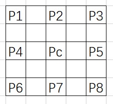 水平方向三个二阶梯度:Dh1 = |P1+P3-2*P2|, Dh2 = |P4+P5-2*Pc|,Dh3 = |P6+P8-2*P7|;