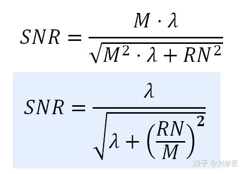 如果光子shot噪声是图像中唯一的噪声源,那么SNR将是收集到的电子数的平方根(λ的平方根在下面的方程中)。注意,这是光的物理特性所施加的信噪比极限。