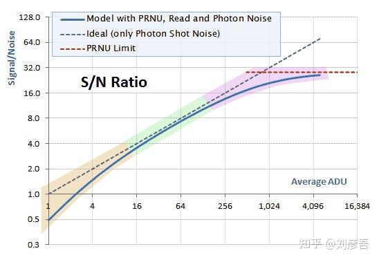 在下图中,我们有一个模拟的信噪比曲线,我们可以区分出三个相位,显示我们所研究的每种噪声类型的优势。在曲线的左端,ADU值较低,在橙色背景区域read噪声使信噪比低于代表理想传感器的灰色虚线,只有shot noise。在第二部分,用绿色的背景显示,信噪比是由shot noise主导的,并“保持”在0.5左右的斜率。在右端,即粉色背景区域,信噪比减缓增长速度并开始弯曲,逐渐低于PRNU极限(见公式14),用红线虚线表示。