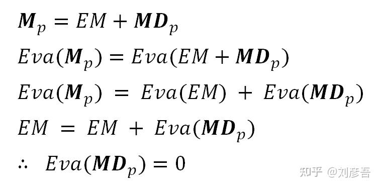 注意,这种表达Mp的方式意味着MDp的平均值为零(Eva(MDp) = 0)。我们可以将期望值运算符应用到前一个方程的两端,并使用“Eva(EM) = EM”来探究这个问题: