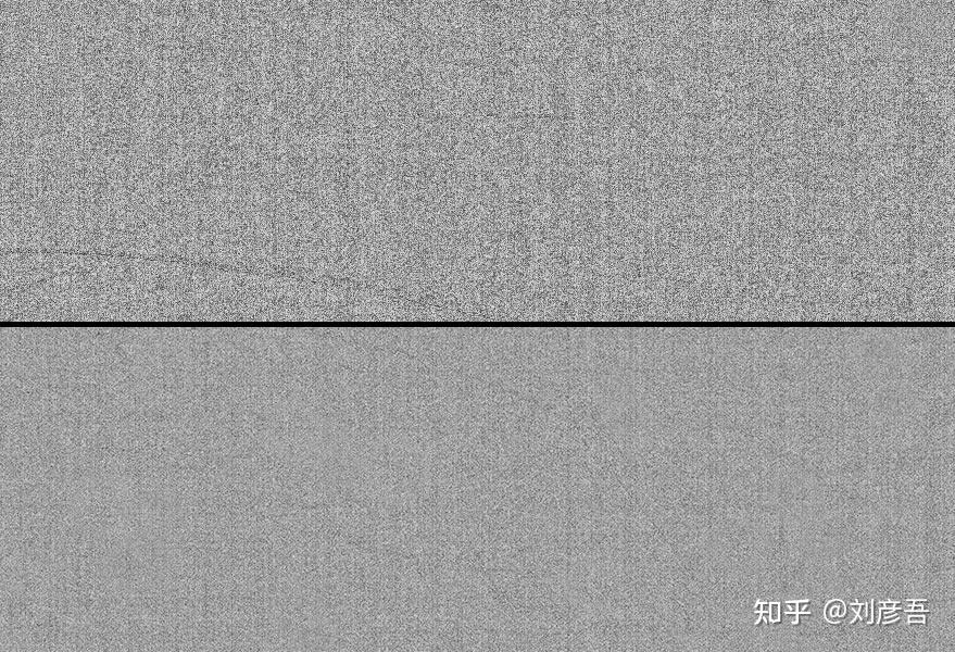 得到的孤立图像PRNU噪声如下图所示。这幅图像经过处理,使其结构更加明显。上半部分显示的是100%尺度的图像PRNU噪声;左下角有一块(清洁不当的)污迹。下半部分显示了图像的另一部分PRNU噪声,但在50%的比例,它使垂直图案更明显,但也有一些水平图案。