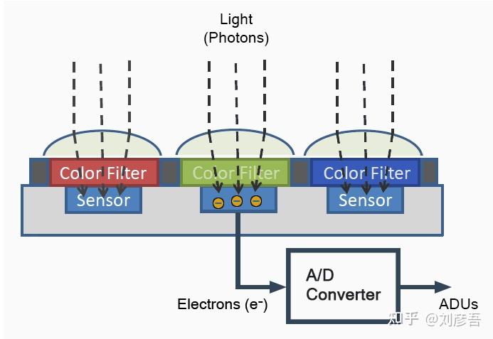正如在之前的文章中提到的的,每个相机像素只对一种RGB(红、绿、蓝)颜色分量敏感,下图简单描述了DSLR相机传感器如何将击中它的光子转换成ADUs中的RGB像素值。