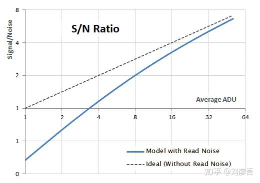 如果我们比较这个传感器模型(shot+read noise)和理想传感器(shot noise)的SNR,我们得到如下图所示的模拟:
