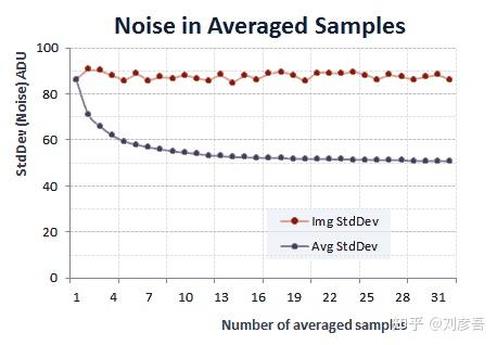 在上面的方程中,我们可以看到PRNU二次项是不受平均影响的,而其他种类的噪声的影响随着平均图像数量的“n”值的增大而减小。我们用相机镜头在iPad屏幕上拍摄了32张单色照片。生成的RAW图像的绿色像素值为其上限的87%。换句话说,他们过曝但并没有超出上限。为了显示平均对结果图像的方差的影响,下面的图表显示了每个单独图像的绿通道的噪声(标准差),以及由不同数量的照片的平均值产生的图像噪声。我们使用Iris软件(add_mean命令)获得了这些平均图像。