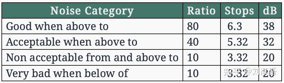 如在下表中,是一个DxO Mark相机评测的SNR结果,我们能看出几种SNR表示的关系: