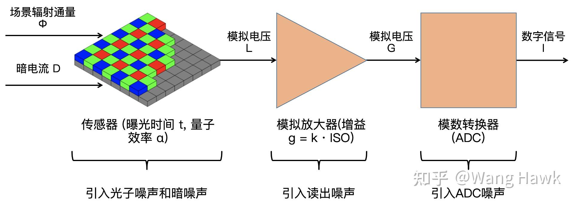 这里面场景的光辐射通量是 \phi ,它照射到传感器上通过光电效应产生电子,与此同时,传感器自身因为温度等因素的影响会释放出一些电子,它们构成了暗电流D。光辐射和暗电流共同作用到像素上,产生了模拟电压L。这些电压在模拟放大器的作用下会变成模拟电压G,后者进入到模数转换器后,最终变成了数字信号。