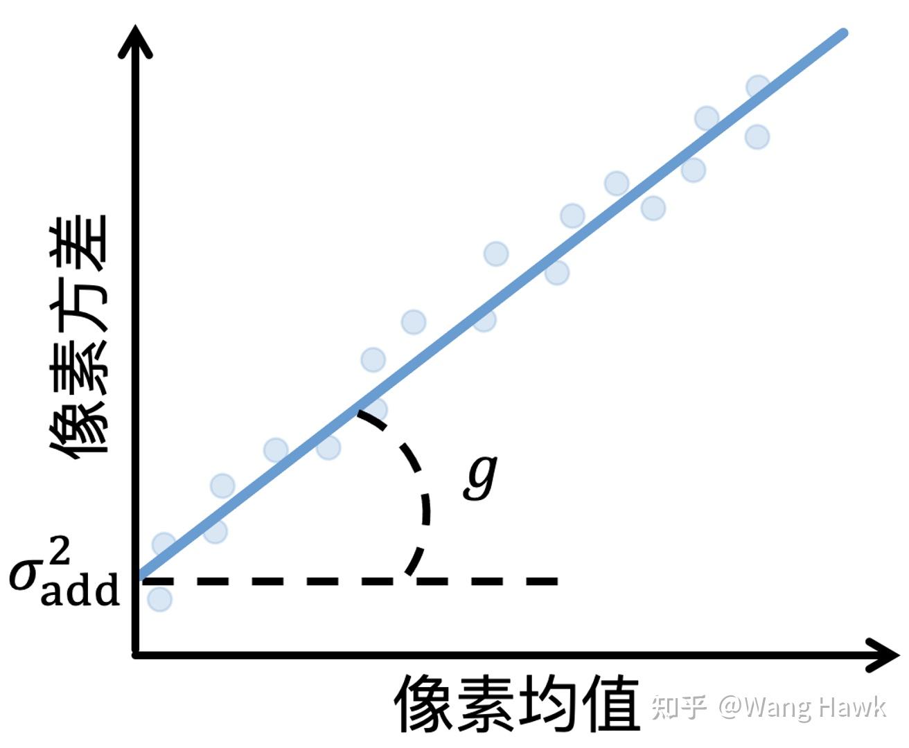 然后对每张图像,我们首先减去当前的暗帧(需要按照曝光时长进行补偿),然后求取每个像素的均值的方差。此时如果我们把大量像素的均值和方差画在下面这张图上,可以看到它们几乎形成了一条直线,并且增益g是这条直线的斜率,而方差 \sigma_{add}^2 则是这条直线的截距。通过采样大量不同均值的像素点的信息,可以很容易的拟合出这条直线,并求得g和对应的加性噪声方差 \sigma_{add}^2 (这也是为何要用上面的灰阶图卡的原因)