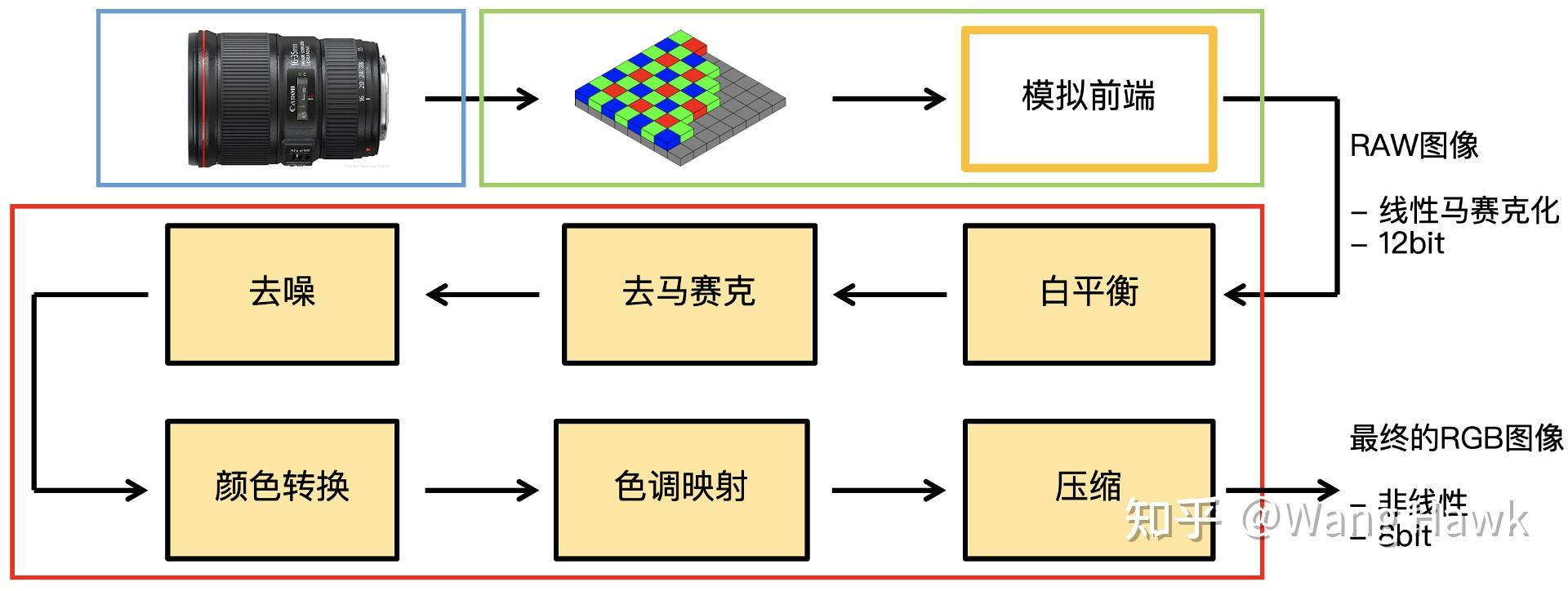 在2. 从入射光到JPEG相片-数码相机内部的秘密中,我们看到了成像系统是如何把入射光变成最终的JPEG图像的: