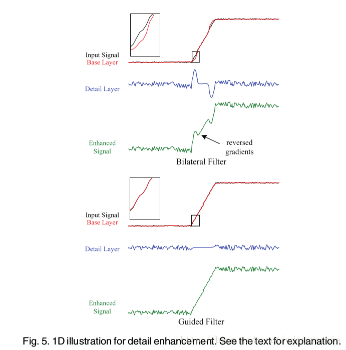 除了速度优势以外,导向滤波的一个很好的性能就是可以保持梯度,这是bilateral做不到的,因为会有梯度翻转现象。(Preserves edges, but not gradients)。