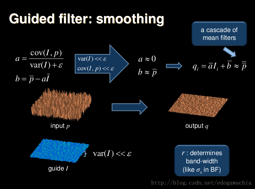 - 如果方差较小,即是一个平滑区域的话,那么方差较小约等于0,则ak约等于方差除以epsilon,因此 ak 约等于 0 。那么bk约等于1, 那么qi = mean(p),这样相当于说这个pixel在该窗口内的输出值相当于在这个窗口进行了均值平滑,而考虑到pixel属于多个窗口,如果这是一个平滑区域,那么就相当与多个均值平滑滤波器的级联。
