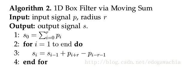 文中还提到一个计算fmean时候的加速算法,由于计算每个像素点都要对周围2r+1个点进行求和(1D情况),但是相邻内两个需要计算的像素点实际上只有一个求和的加数有差别,即右边的pixel只是将左边的pixel已经求好的和减去求和时候的最左边一个数,再加上最右边的右边的数值。例如,如果 r=2 求 fmean(5) = f(3) + f(4) + f(5) + f(6) + f(7) ,而fmean(6) = f(4) + f(5) + f(6) + f(7) + f(8) ,因此 fmean(6) = fmean(5) - f(3) + f(8) 。这样计算当r比较大的时候可以显著减少运算量,避免了重复求和。算法如下: