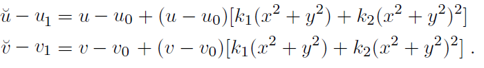 上面的公式 \bar{u},\bar{v} 是畸变图像中的某点像素坐标, u,v是矫正后图像中对应点的像素坐标, u_{0},v_{0} 是矫正后图像的中心点像素坐标, u_{1},v_{1} 是畸变图像中心点像素点坐标, x,y 是矫正后图像点坐标在横纵方向到中心点的像素数也就是图像坐标,所以 x^{2}+y^{2} 可以看作以中心点为圆心的圆的半径平方。那么这两个公式是分别求图像横纵方向的像素偏差补偿,补偿系数为 [k_{1}(x^{2}+y^{2})+k_{2}(x^{2}+y^{2})^{2}],可以看出 补偿系数分布服从二次函数,其实补偿系数后面还可以有 k_{3}、k_{4} 项,在实际应用中前两项够用。