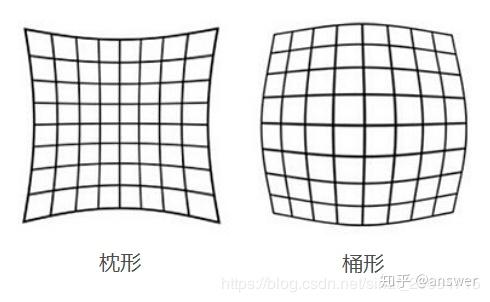 (1)径向畸变(枕形、桶形):光线在远离透镜中心的地方比靠近中心的地方更加弯曲。